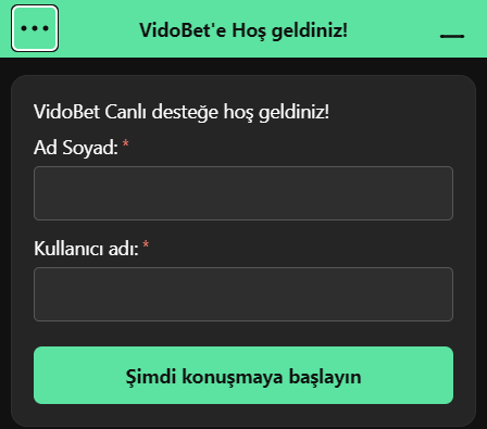 Vidobet canlı destek hizmetine ulaşmak oldukça kolaydır. Web sitesine giriş yaptıktan sonra ana sayfada bulunan canlı destek simgesini tıklamanız yeterlidir. Daha sonra açılan pencerede bilgilerinizi girip sorununuzu yazarak canlı sohbeti başlatabilirsiniz.